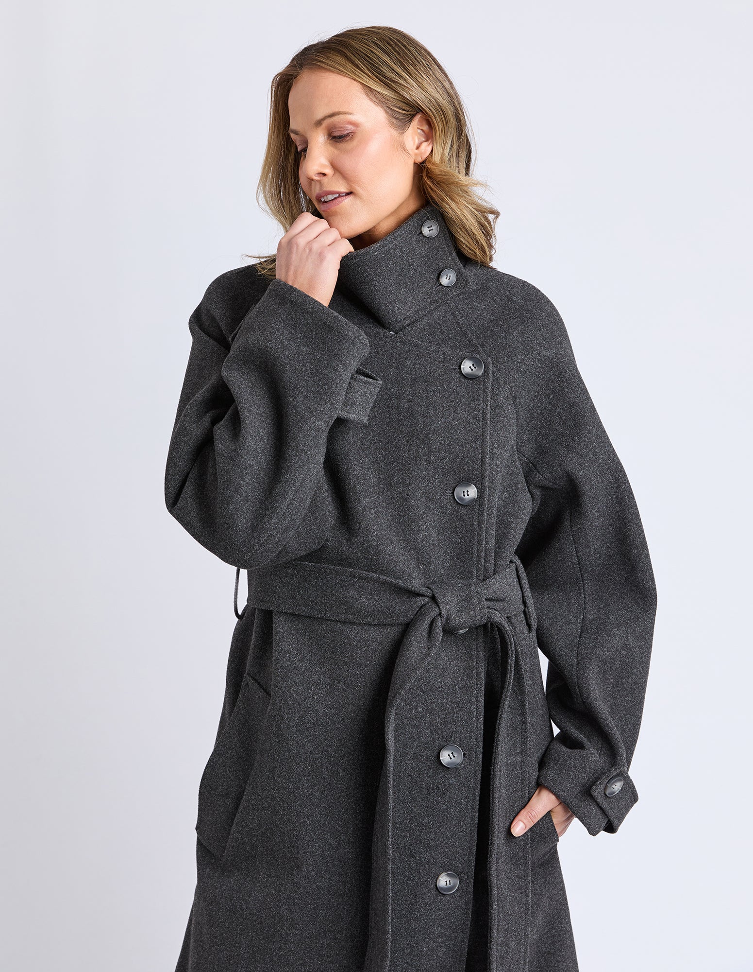 Meet CAROLINE the high neck button long coat that will take you to weekends away or wear it to work as this jacket is so versatile you will not want to take it off.