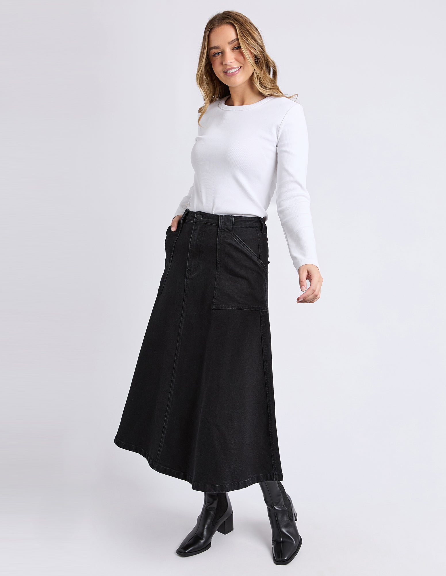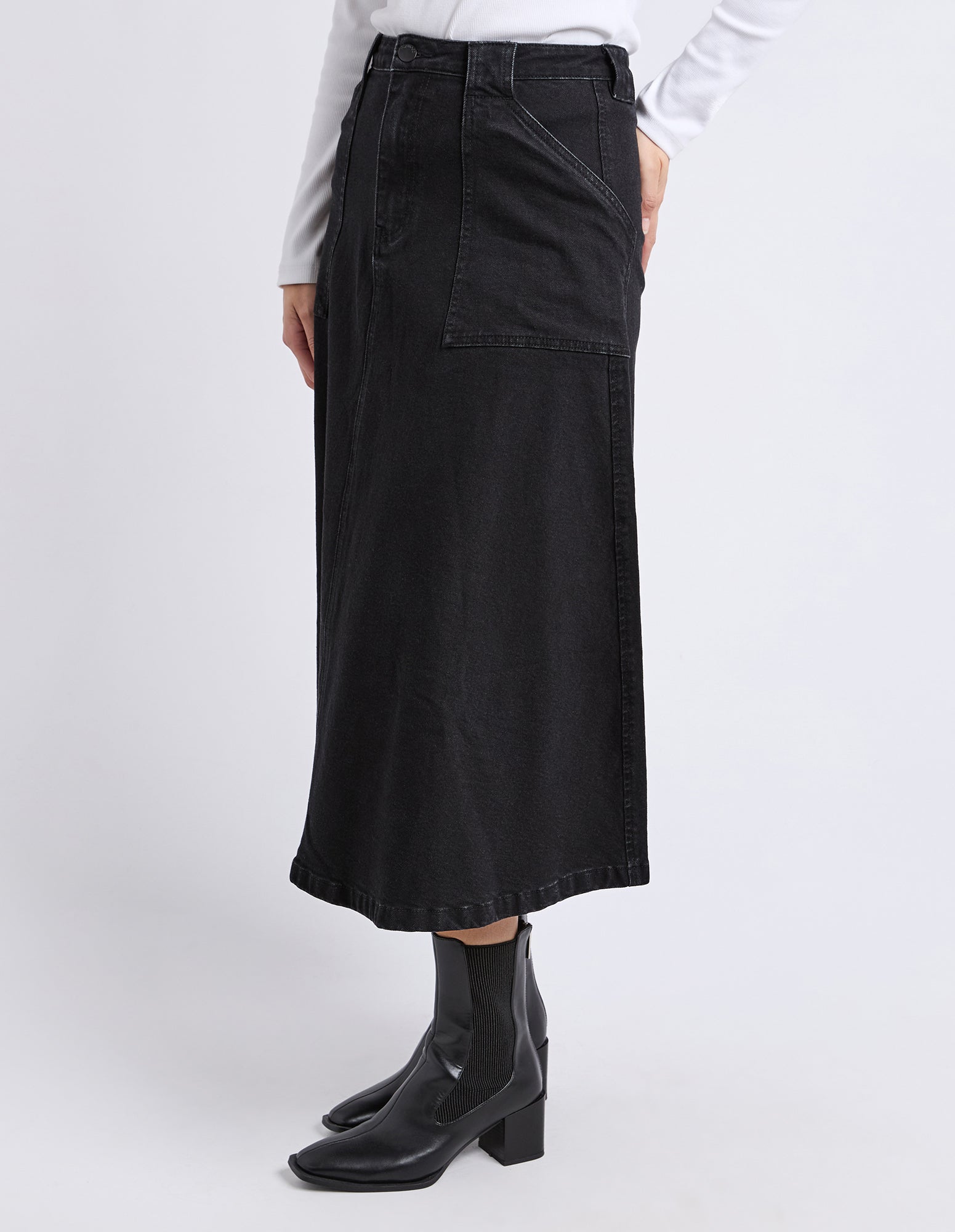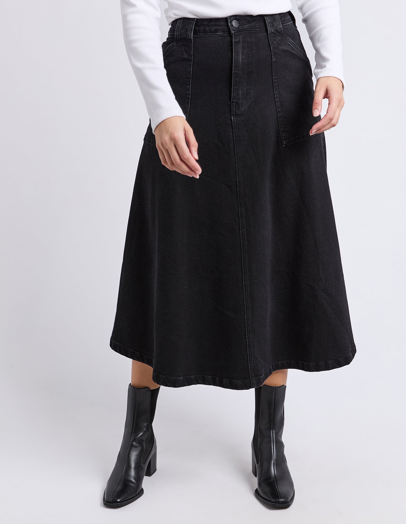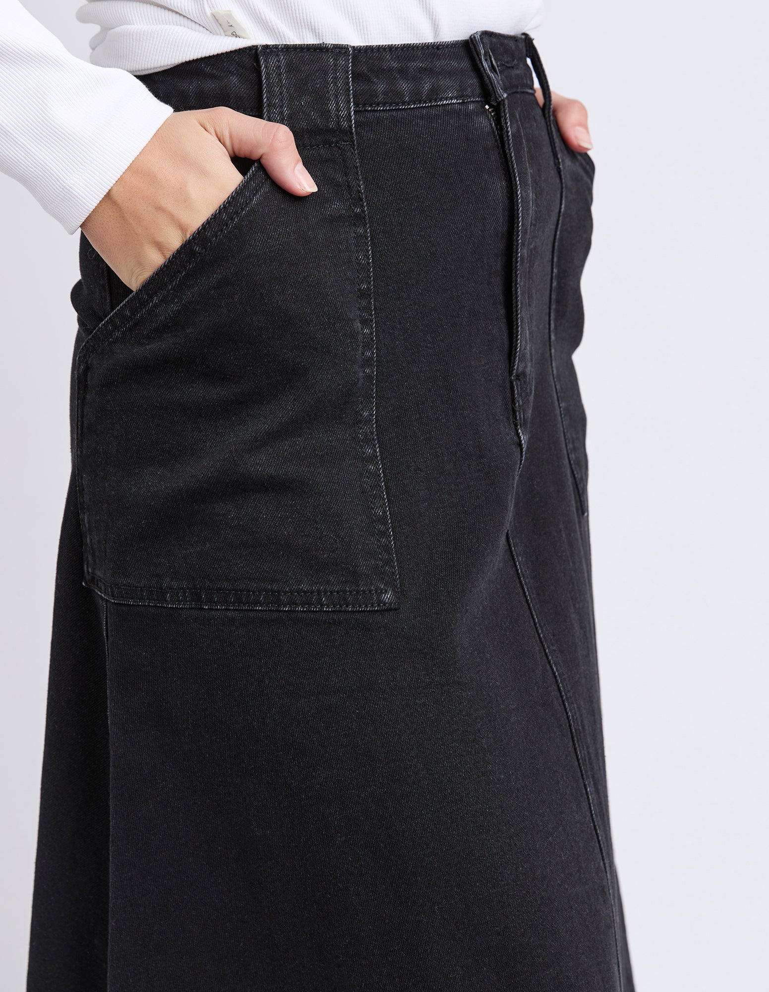 The Potter Skirt brings a modern spin to classic denim plus we have it in as featured in washed black with its full, easy-moving shape and clean front fly. Designed with front patch pockets and just the right amount of stretch, it’s made for all-day comfort without losing structure. Style it with boots or sneakers and let it do the talking.