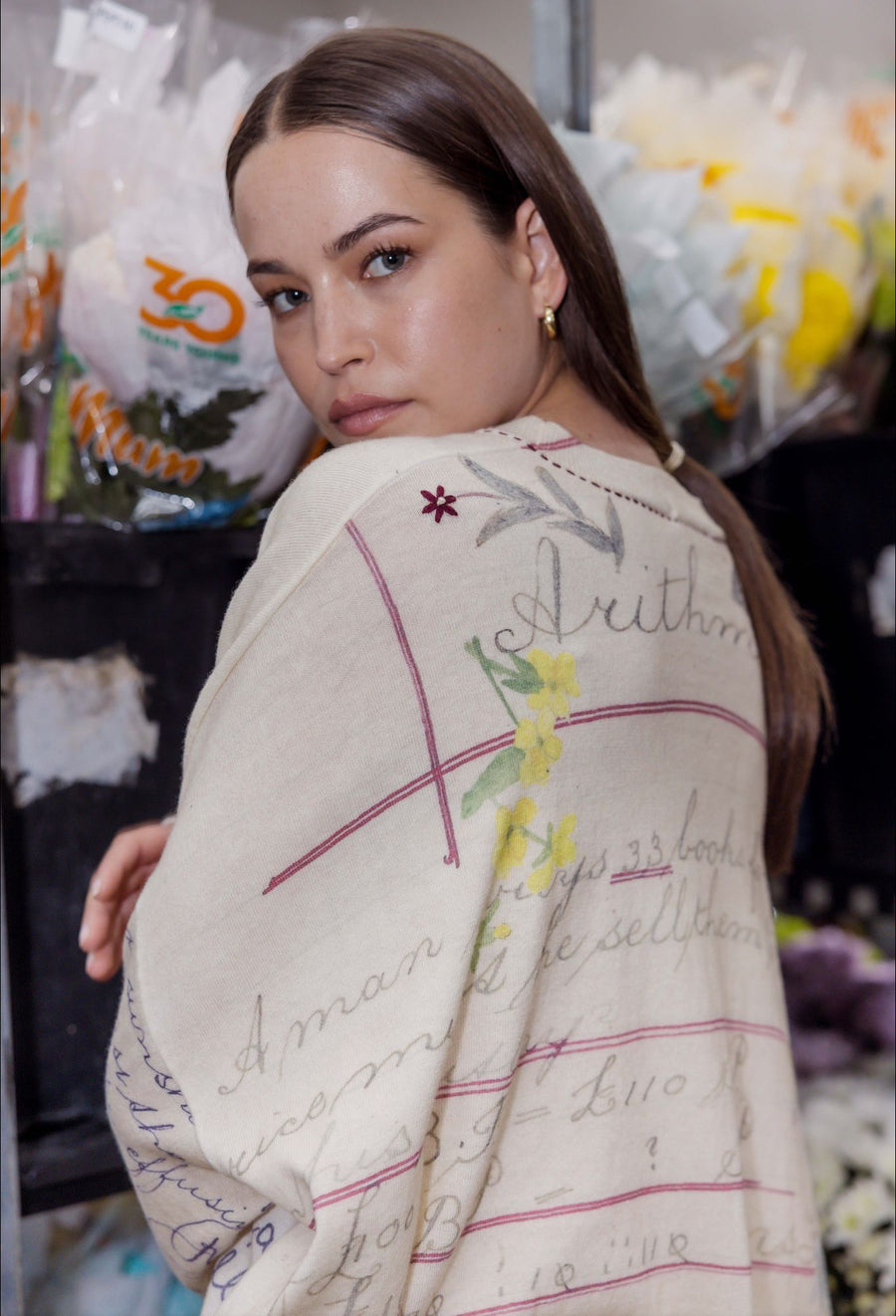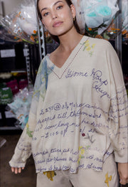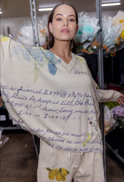 Discover the stylish and unique design of The Calla Jumper by Maud Alice Dainty. This lightweight knit features ribbed edges, a subtle v-neck, and side splits for a laid-back look. The bold print combines geometric shapes to create a striking pattern. With its oversized fit, wide cut, and drop shoulders, this jumper offers a relaxed and comfortable style. The homework print is a curated selection of water colour paintings, hand-written notes, and more.