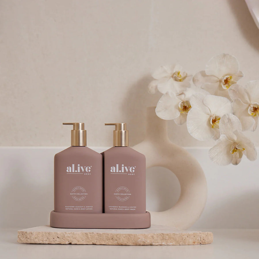 Introducing the al.ive body Metallic Edition Wash & Lotion Duo, a limited edition set that is as much a styling piece as it is a luxurious body care product. Expertly designed by our founders and renowned interior designers Alisa & Lysandra, this set will elevate the look and feel of any bathroom or vanity.