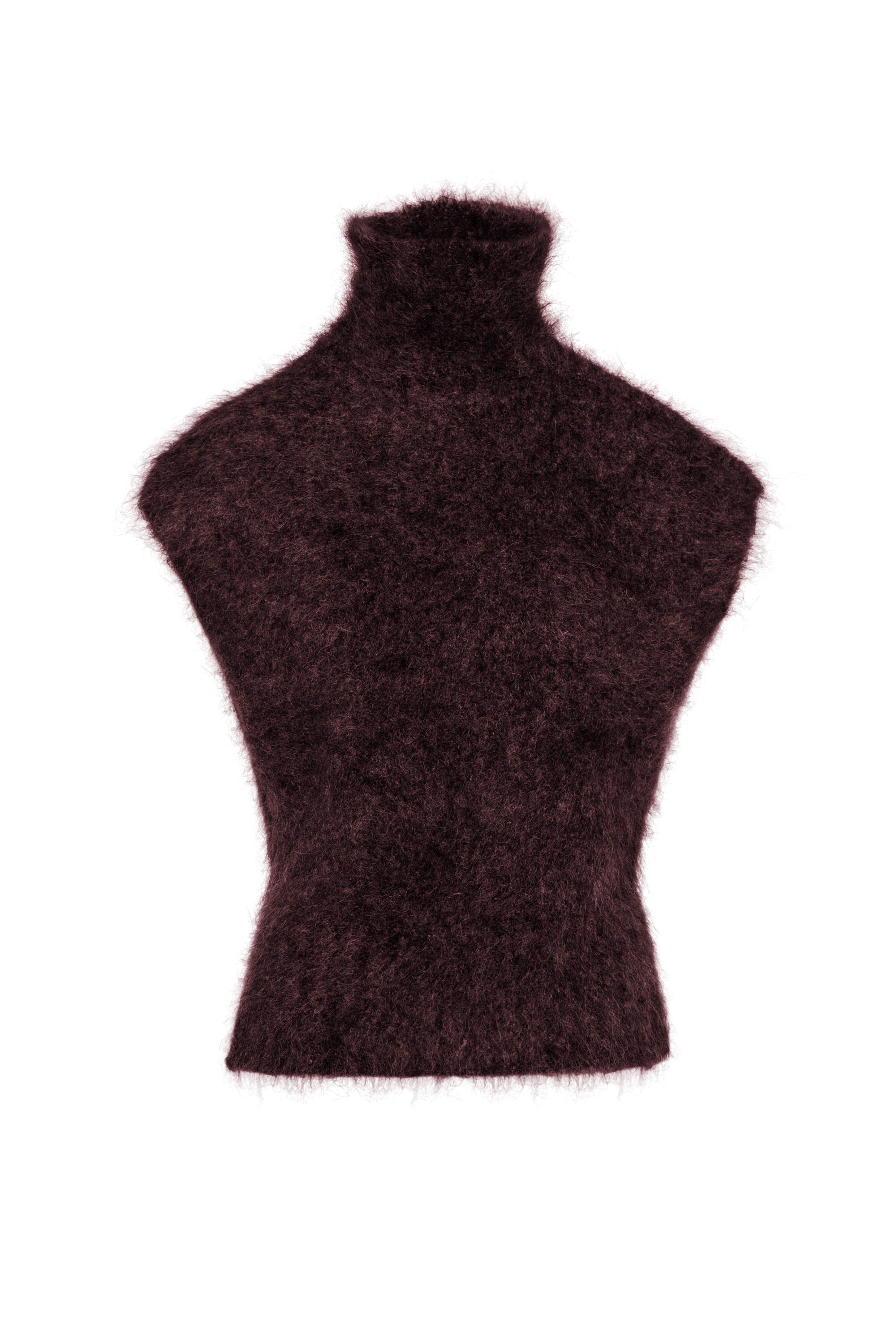 Soft mohair wool funnel neck vest in a luxurious merlot tone. Cut to sit just over the hips, it's designed to layer beautifully with long-sleeve wool bodies for effortless, versatile styling. The funnel neckline adds contemporary elegance to any neutral wardrobe. Designed in Australia. Our model wears size S/10 and stands 175cm tall. Care: Cold hand wash only. Do not bleach, soak, wring or tumble dry. Cool iron or dry clean (P).